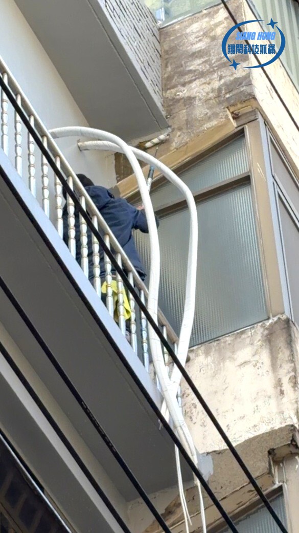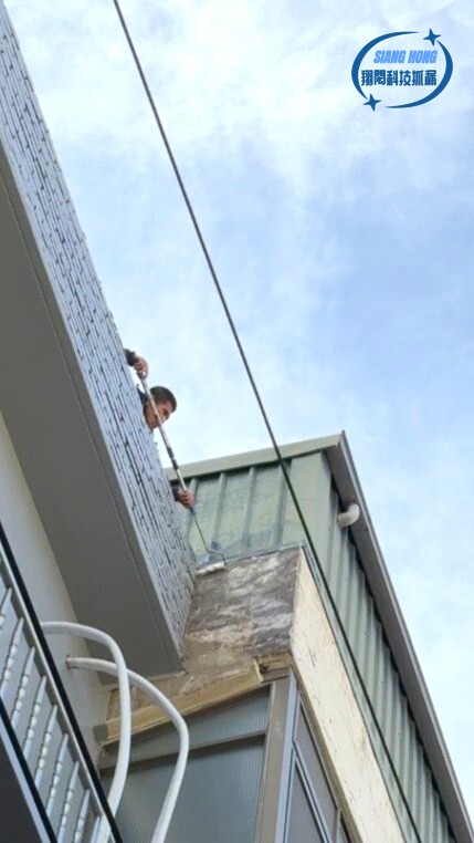 照片中可以看到師傅在狹窄的外牆邊,